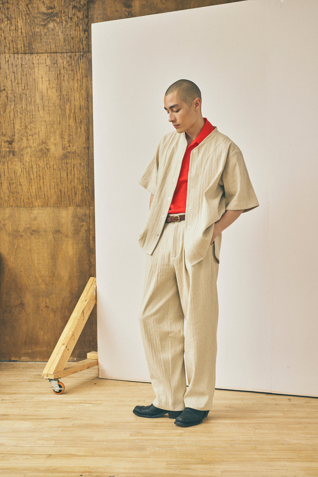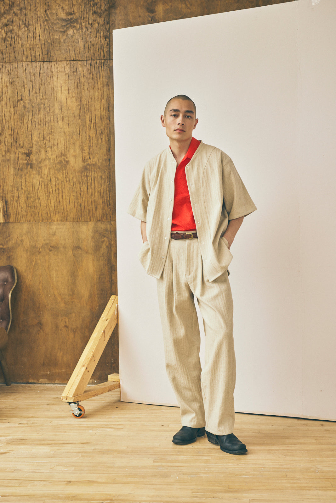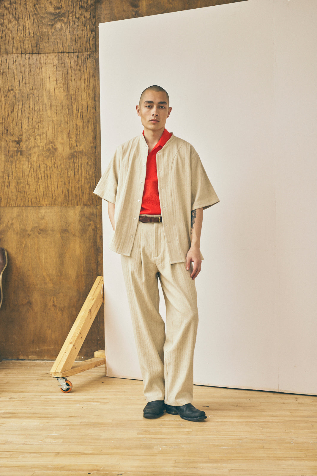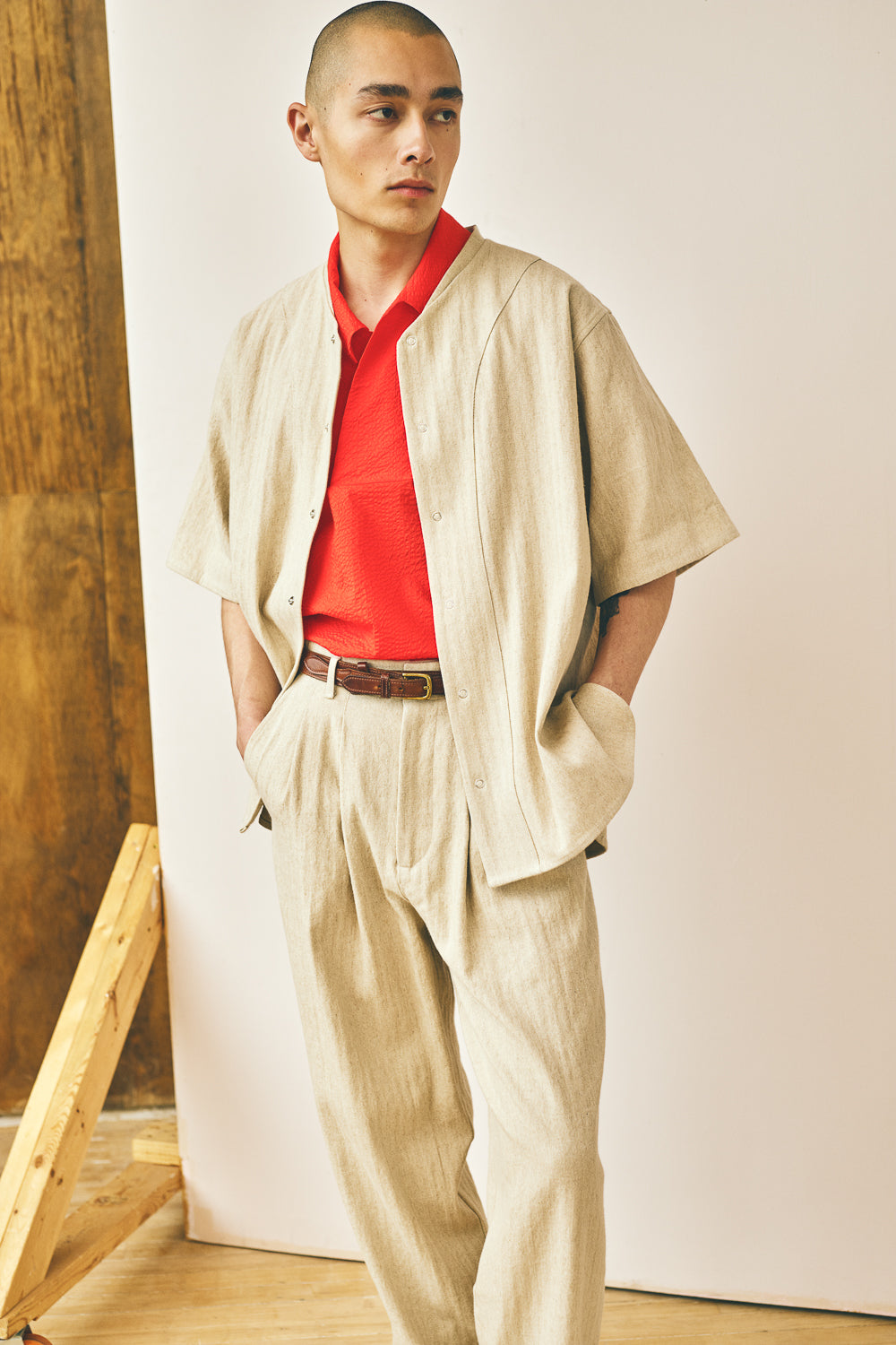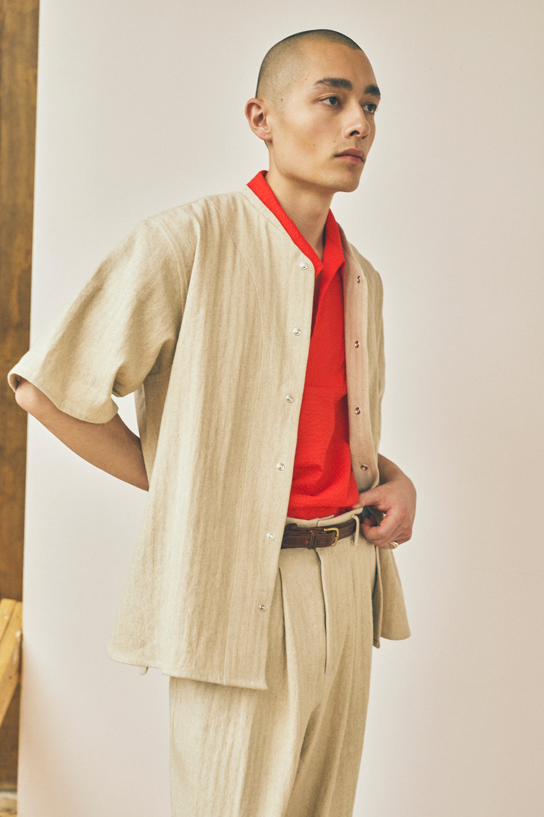 New for Spring/Summer 2026 and inspired by vintage baseball uniforms from the 1920's and classic workwear. The Baseball Tee is cut with movement in mind and features flat-felled seams, a slim collar band, curved hems, and a snap front closure.