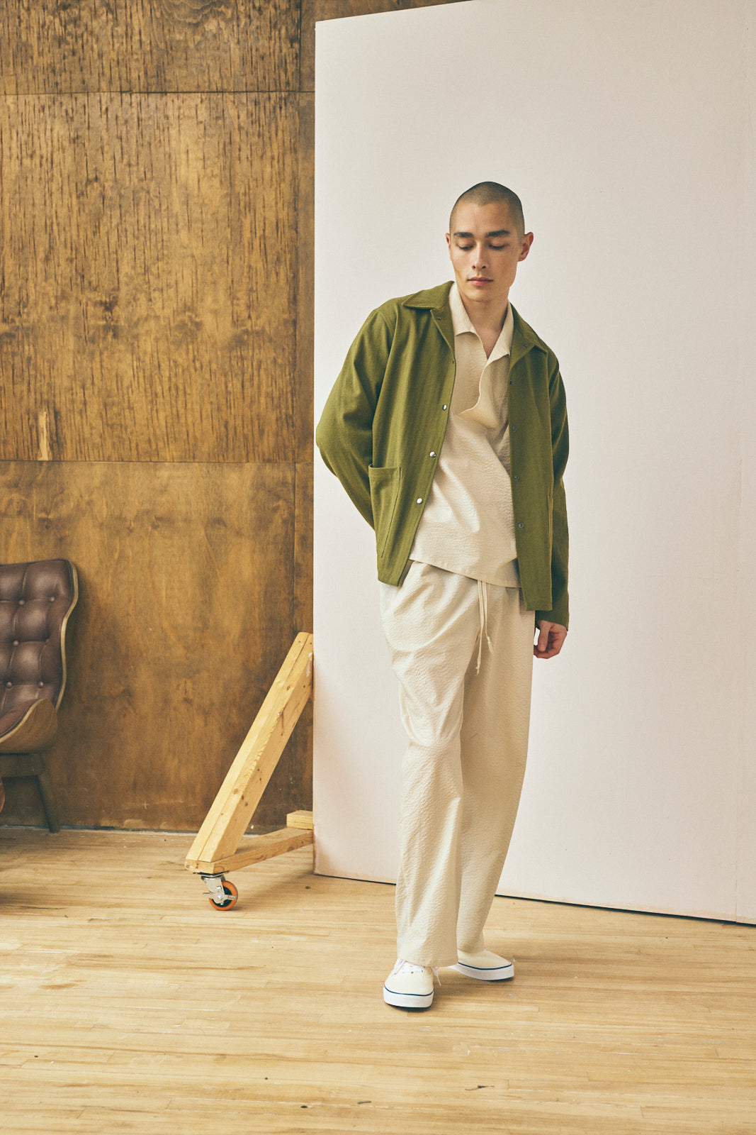 The Work Shirt is based on a classic style from our archive. This season, our Work Shirt is cut from herringbone weave fabric milled, dyed, and washed in Kyoto, Japan. The fabric has been treated with a "vintage" process, and will develop characteristic fades with time, similar to indigo denim. The work shirt features an interior chest pocket, two front patch pockets, a snap closure, and flat-fell seams throughout.