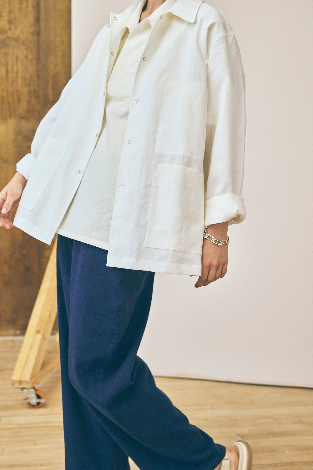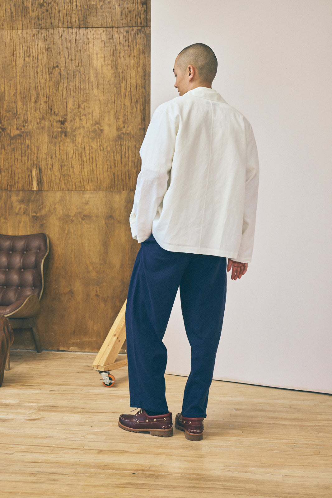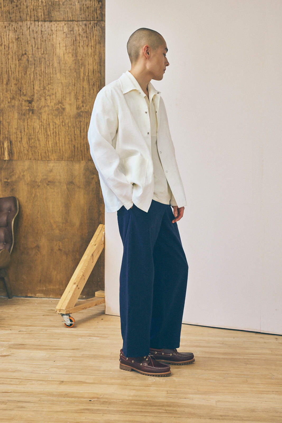 The Work Shirt is based on a classic style from our archive. For this edition of our Work Shirt, we've used a deadstock laminated linen from our studio archive. This fabric was originally milled in Italy and features a semi-water repellent finish with the crisp texture of classic linen. The work shirt features an interior chest pocket, two front patch pockets, a snap closure, and flat-fell seams throughout.