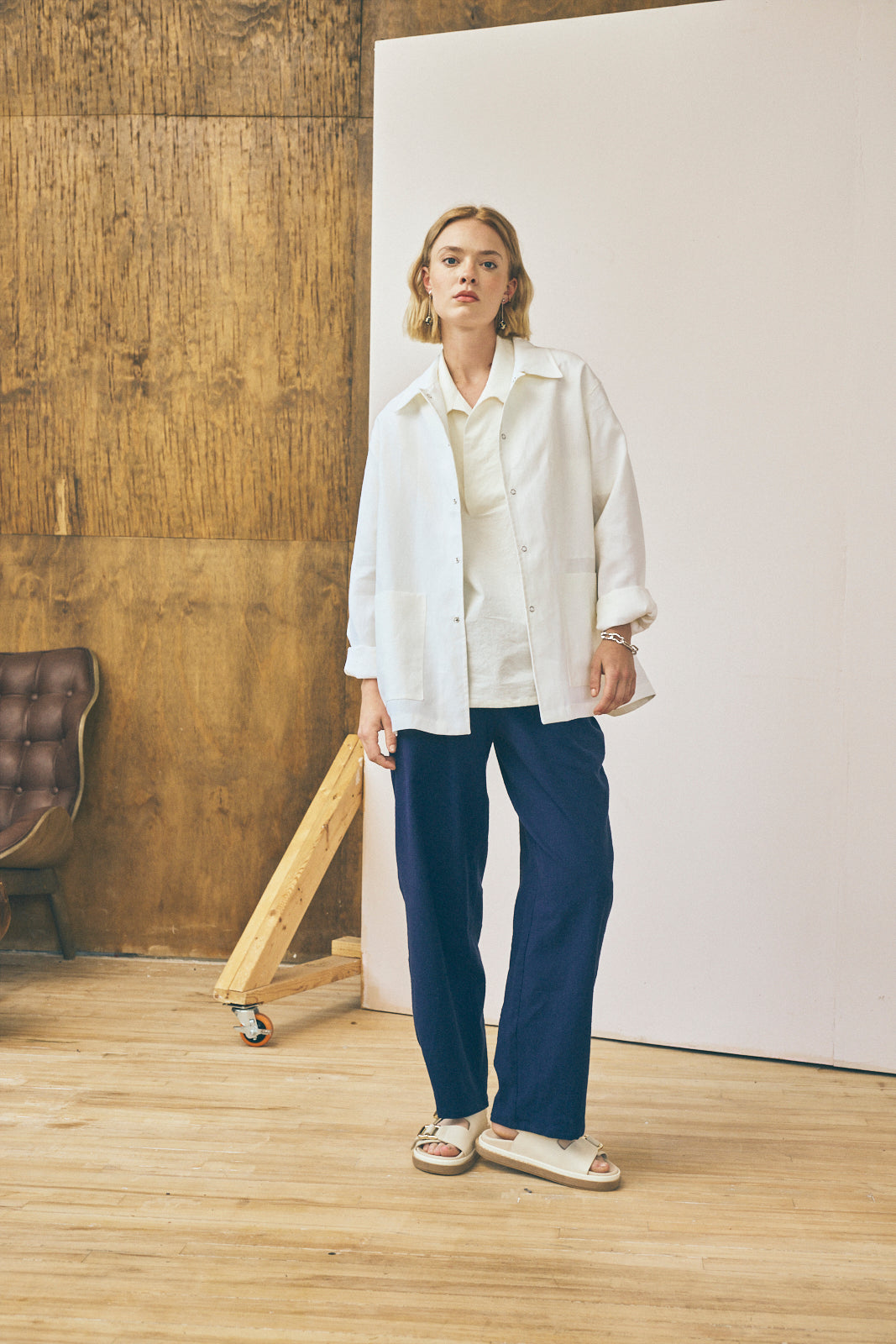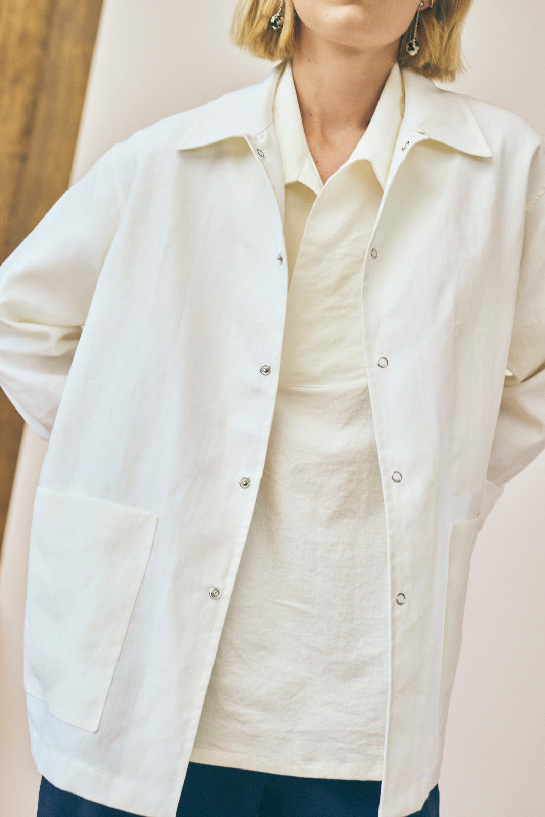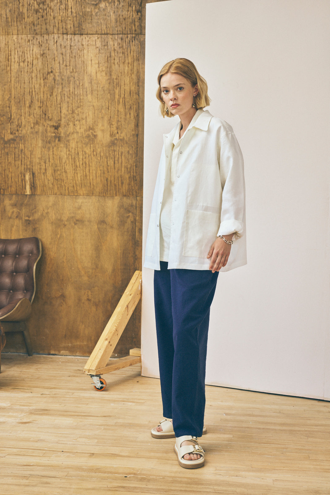 The Work Shirt is based on a classic style from our archive. For this edition of our Work Shirt, we've used a deadstock laminated linen from our studio archive. This fabric was originally milled in Italy and features a semi-water repellent finish with the crisp texture of classic linen. The work shirt features an interior chest pocket, two front patch pockets, a snap closure, and flat-fell seams throughout.